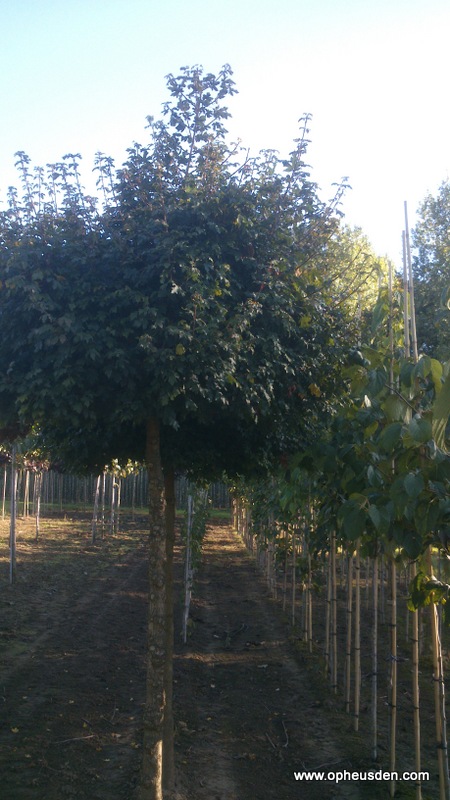 | |  Acer campestre Nanum | Hoogte: | 2,5 - 3 m (vanaf entplaats) | | Kroon: | bolrond, zeer dicht | | Schors en takken: | grijze schors | | Blad: | 3/5-lobbig, donkergroen, 4 - 6 cm | | Bloemen: | kleine, eindstandige tuilen, geelgroen, mei | | Vruchten: | eenzadig, gevleugeld, steeds twee bijeen | | Toepassing: | op stam geënt (op 2,2 m) als solitair of in kleine groepen | | Grondsoort: | alle, behalve droge arme zandgrond | | Windbestendigheid: | goed | |