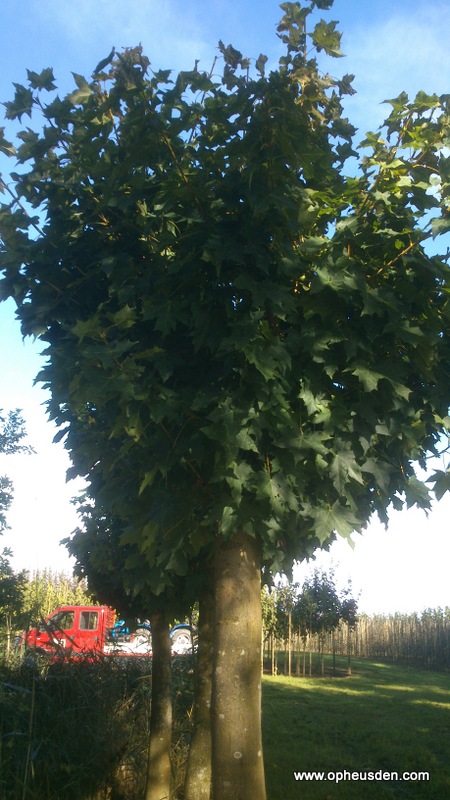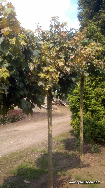 | |   Acer platanoides Globosum | Hoogte: | 5 - 7 m | | Kroon: | rond, later plat bolvormig | | Schors en takken: | schors donkergrijs, takken lichtbruin | | Blad: | 5/7-lobbig, groen, circa 18 cm, in herfst goudgeel | | Bloemen: | geelgroen, in tuilen, april, vóór bladontwikkeling | | Vruchten: | gevleugelde nootvrucht (samara), 3,5 - 4,5 cm lang | | Toepassing: | kleine tuin, straten, lanen en pleinen | | Grondsoort: | alle, behalve veengrond | | Windbestendigheid: | weinig gevoelig, niet zeewindbestendig | |