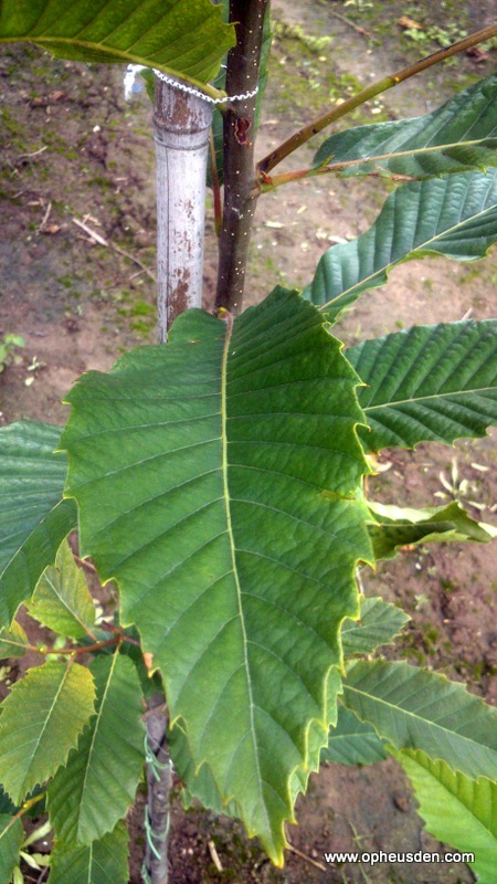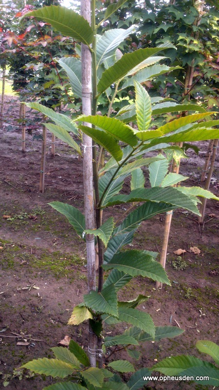 | |   Castanea sativa | Hoogte: | 20 - 30 m | | Kroon: | rond, grillig | | Schors en takken: | (grijs)bruin, later met diepe lengtegroeven | | Blad: | langwerpig, glimmend donkergroen, getand, 10 - 25 cm | | Bloemen: | in roomkleurige katjes, 8 - 13 cm lang, juni/juli | | Vruchten: | stekelige bolster met 2 - 3 noten (kastanjes) | | Toepassing: | parkboom | | Grondsoort: | luchtige, vruchtbare, humushoudende bodem | | Windbestendigheid: | goed | |