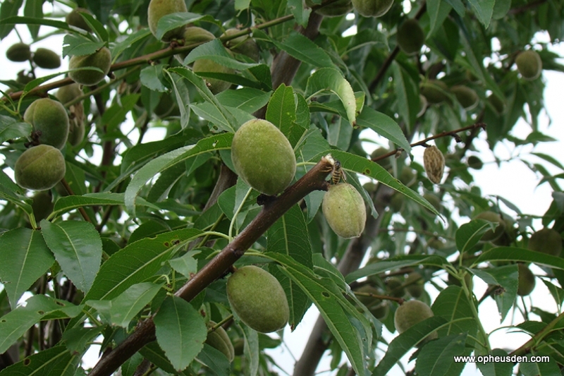 | Prunus dulcis - amandel Prunus dulcis, de amandel, is een tot 10 m hoge boom met een brede kroon. De bladeren zijn langwerpig lancetvormig en tot 12 cm lang. De witte tot lichtroze bloemen bloeien in maart en april. Ze bezitten veel nectar en trekken daardoor insecten aan. Vooral bijen en allerlei soorten vliegen bezoeken deze planten graag en zorgen voor de bestuiving. Hij is niet alleen interessant vanwege de vruchten, maar is ook een fraaie sierboom. De amandel wil het op een warme plaats best doen. Bij ons wordt hij in de eerste plaats gekweekt voor de rijke roze bloesem, maar onder warme omstandigheden worden ook de eetbare vruchten gevormd. Al vroeg in het jaar die vruchten aan de boom te onderscheiden. Pas tegen het eind van de zomer rijpen ze uit. Ze hebben de vorm van kleine abrikozen. De amandel vindt zowel culinaire als cosmetische toepassingen. Er zijn zoete en bittere amandelen, ze bevatten veel olie en eiwit, maar zijn eerder arm aan zetmeel. |